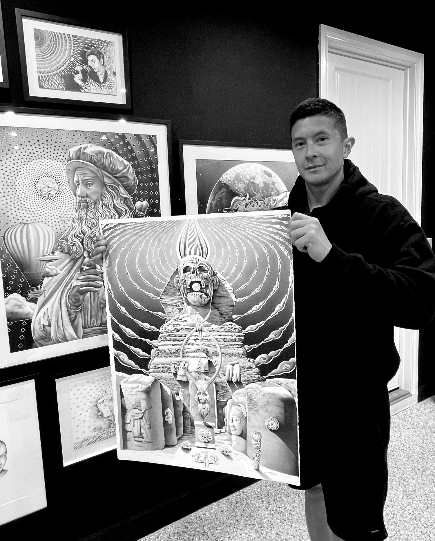 Tim has a holistic approach to life and art, with each of his pieces reflecting themes and ideas that first spark his own intellectual and spiritual curiosity. Whether it’s ancient history, psychedelic exploration, or the concept of interconnectedness—his work is driven by a desire to understand and communicate these concepts clearly through art.
